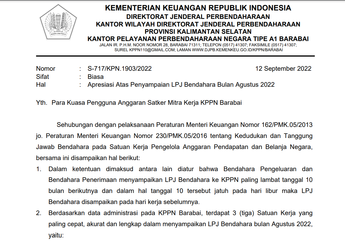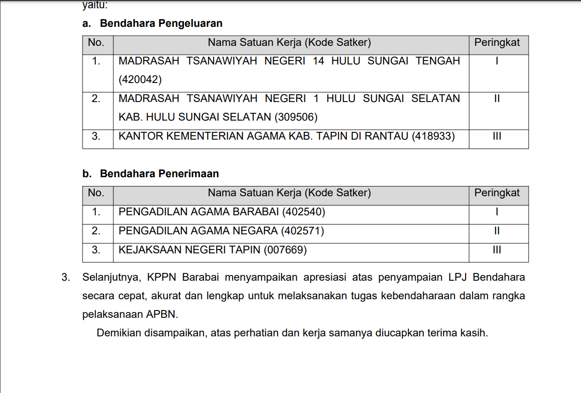 BENDAHARA PENGADILAN AGAMA BARABAI DAPATKAN APRESIASI DARI KPPN