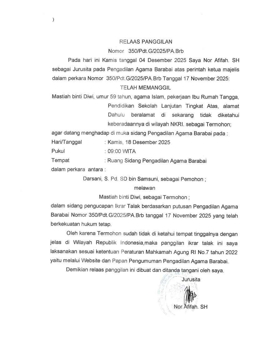 PENGUMUMAN RELAAS PEMBERITAHUAN PUTUSAN PERKARA GHAIB | 363/Pdt.G/2025/PA.Brb