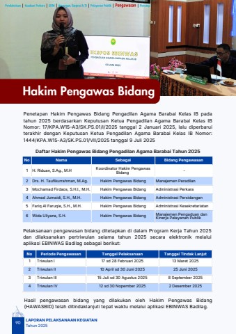 No Nama Sebagai Bidang Pengawasan1 H. Riduan, S.Ag., M.HKoordinator Hakim PengawasBidang-2 Drs. H. Taufikurrahman, M.Ag. Hakim Pengawas Bidang Manajemen Peradilan3 Mochamad Firdaos, S.H.I., M.H. Hakim Pengawas Bidang Administrasi Perkara4 Ahmad Jumaidi, S.H., M.H. Hakim Pengawas Bidang Administrasi Persidangan5 Fariq Al Faruqie, S.H., M.H. Hakim Pengawas Bidang Administrasi Kesekretariatan6 Wida Uliyana, S.H. Hakim Pengawas Bidang Manajemen Pengaduan danKinerja Pelayanan PublikNo Periode Pengawasan Tanggal Pelaksanaan Tanggal Tindak Lanjut1 Triwulan I 17 sd 28 Februari 2025 13 Maret 20252 Triwulan II 10 April sd 30 Juni 2025 25 Juni 20253 Triwulan III 15 Juli sd 30 Agustus 2025 8 September 20254 Triwulan IV 12 sd 30 Nopember 2025 2 Desember 202590LAPORAN PELAKSANAAN KEGIATANTahun 2025Hakim Pengawas BidangPenetapan Hakim Pengawas Bidang Pengadilan Agama Barabai Kelas IB padatahun 2025 berdasarkan Keputusan Ketua Pengadilan Agama Barabai Kelas IBNomor: 17/KPA.W15-A3/SK.PS.01/I/2025 tanggal 2 Januari 2025, lalu diperbaruiterakhir dengan Keputusan Ketua Pengadilan Agama Barabai Kelas IB Nomor:1444/KPA.W15-A3/SK.PS.01/VII/2025 tanggal 9 Juli 2025Daftar Hakim Pengawas Bidang Pengadilan Agama Barabai Tahun 2025Pelaksanaan pengawasan bidang ditetapkan di dalam Program Kerja Tahun 2025dan dilaksanakan pertriwulan selama tahun 2025 secara elektronik melaluiaplikasi EBINWAS Badilag sebagai berikut:Hasil pengawasan bidang yang dilakukan oleh Hakim Pengawas Bidang(HAWASBID) telah ditindaklanjuti tepat waktu melalui aplikasi EBINWAS Badilag.