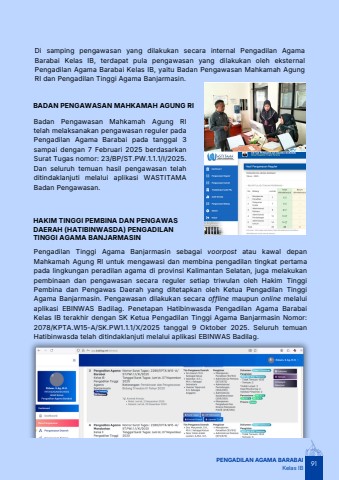 91PENGADILAN AGAMA BARABAIKelas IBDi samping pengawasan yang dilakukan secara internal Pengadilan AgamaBarabai Kelas IB, terdapat pula pengawasan yang dilakukan oleh eksternalPengadilan Agama Barabai Kelas IB, yaitu Badan Pengawasan Mahkamah AgungRI dan Pengadilan Tinggi Agama Banjarmasin.BADAN PENGAWASAN MAHKAMAH AGUNG RIBadan Pengawasan Mahkamah Agung RItelah melaksanakan pengawasan reguler padaPengadilan Agama Barabai pada tanggal 3sampai dengan 7 Februari 2025 berdasarkanSurat Tugas nomor: 23/BP/ST.PW.1.1.1/I/2025.Dan seluruh temuan hasil pengawasan telahditindaklanjuti melalui aplikasi WASTITAMABadan Pengawasan.HAKIM TINGGI PEMBINA DAN PENGAWASDAERAH (HATIBINWASDA) PENGADILANTINGGI AGAMA BANJARMASINPengadilan Tinggi Agama Banjarmasin sebagai voorpost atau kawal depanMahkamah Agung RI untuk mengawasi dan membina pengadilan tingkat pertamapada lingkungan peradilan agama di provinsi Kalimantan Selatan, juga melakukanpembinaan dan pengawasan secara reguler setiap triwulan oleh Hakim TinggiPembina dan Pengawas Daerah yang ditetapkan oleh Ketua Pengadilan TinggiAgama Banjarmasin. Pengawasan dilakukan secara offline maupun online melaluiaplikasi EBINWAS Badilag. Penetapan Hatibinwasda Pengadilan Agama BarabaiKelas IB terakhir dengan SK Ketua Pengadilan Tinggi Agama Banjarmasin Nomor:2078/KPTA.W15-A/SK.PW1.1.1/X/2025 tanggal 9 Oktober 2025. Seluruh temuanHatibinwasda telah ditindaklanjuti melalui aplikasi EBINWAS Badilag.