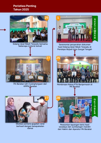 Sidang Isbat Nikah Terpadu bersamabeberapa instansi terkaitSEPTEMBERSeremonial penyerahan dokumenhasil Sidang Isbat Nikah Terpadu diPendopo Bupati Hulu Sungai Tengah28OKTOBER251272725Peresmian lapangan tenis hasilswadaya dan sumbangan mandiridari Hakim dan Aparatur PA BarabaiPembinaan Ketua PTA Banjarmasin diPA BarabaiPA Barabai raih 3 penghargaan dariKPPN BarabaiMediasi perkara gugatan ceraiberhasil dengan kesepakatandamaiPeristiwa PentingTahun 2025