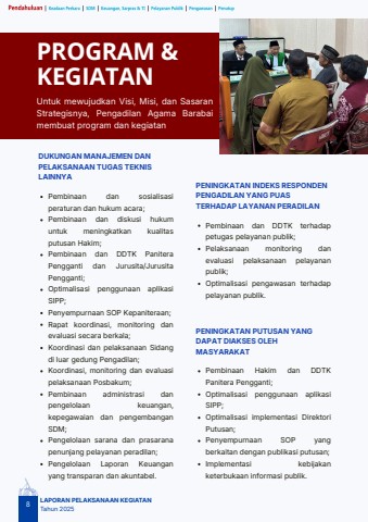 8LAPORAN PELAKSANAAN KEGIATANTahun 2025PROGRAM &KEGIATANUntuk mewujudkan Visi, Misi, dan SasaranStrategisnya, Pengadilan Agama Barabaimembuat program dan kegiatanPembinaan dan sosialisasiperaturan dan hukum acara;Pembinaan dan diskusi hukumuntuk meningkatkan kualitasputusan Hakim;Pembinaan dan DDTK PaniteraPengganti dan Jurusita/JurusitaPengganti;Optimalisasi penggunaan aplikasiSIPP;Penyempurnaan SOP Kepaniteraan;Rapat koordinasi, monitoring danevaluasi secara berkala;Koordinasi dan pelaksanaan Sidangdi luar gedung Pengadilan;Koordinasi, monitoring dan evaluasipelaksanaan Posbakum;Pembinaan administrasi danpengelolaan keuangan,kepegawaian dan pengembanganSDM;Pengelolaan sarana dan prasaranapenunjang pelayanan peradilan;Pengelolaan Laporan Keuanganyang transparan dan akuntabel.DUKUNGAN MANAJEMEN DANPELAKSANAAN TUGAS TEKNISLAINNYAPembinaan dan DDTK terhadappetugas pelayanan publik;Pelaksanaan monitoring danevaluasi pelaksanaan pelayananpublik;Optimalisasi pengawasan terhadappelayanan publik.PENINGKATAN INDEKS RESPONDENPENGADILAN YANG PUASTERHADAP LAYANAN PERADILANPembinaan Hakim dan DDTKPanitera Pengganti;Optimalisasi penggunaan aplikasiSIPP;Optimalisasi implementasi DirektoriPutusan;Penyempurnaan SOP yangberkaitan dengan publikasi putusan;Implementasi kebijakanketerbukaan informasi publik.PENINGKATAN PUTUSAN YANGDAPAT DIAKSES OLEHMASYARAKAT