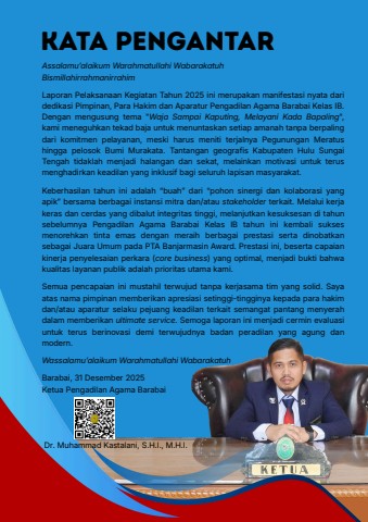 Barabai, 31 Desember 2025Ketua Pengadilan Agama BarabaiDr. Muhammad Kastalani, S.H.I., M.H.I.Assalamu%u2019alaikum Warahmatullahi WabarakatuhBismillahirrahmanirrahimLaporan Pelaksanaan Kegiatan Tahun 2025 ini merupakan manifestasi nyata daridedikasi Pimpinan, Para Hakim dan Aparatur Pengadilan Agama Barabai Kelas IB.Dengan mengusung tema \,kami meneguhkan tekad baja untuk menuntaskan setiap amanah tanpa berpalingdari komitmen pelayanan, meski harus meniti terjalnya Pegunungan Meratushingga pelosok Bumi Murakata. Tantangan geografis Kabupaten Hulu SungaiTengah tidaklah menjadi halangan dan sekat, melainkan motivasi untuk terusmenghadirkan keadilan yang inklusif bagi seluruh lapisan masyarakat.Keberhasilan tahun ini adalah %u201cbuah%u201d dari %u201cpohon sinergi dan kolaborasi yangapik%u201d bersama berbagai instansi mitra dan/atau stakeholder terkait. Melalui kerjakeras dan cerdas yang dibalut integritas tinggi, melanjutkan kesuksesan di tahunsebelumnya Pengadilan Agama Barabai Kelas IB tahun ini kembali suksesmenorehkan tinta emas dengan meraih berbagai prestasi serta dinobatkansebagai Juara Umum pada PTA Banjarmasin Award. Prestasi ini, beserta capaiankinerja penyelesaian perkara (core business) yang optimal, menjadi bukti bahwakualitas layanan publik adalah prioritas utama kami.Semua pencapaian ini mustahil terwujud tanpa kerjasama tim yang solid. Sayaatas nama pimpinan memberikan apresiasi setinggi-tingginya kepada para hakimdan/atau aparatur selaku pejuang keadilan terkait semangat pantang menyerahdalam memberikan ultimate service. Semoga laporan ini menjadi cermin evaluasiuntuk terus berinovasi demi terwujudnya badan peradilan yang agung danmodern.Wassalamu%u2019alaikum Warahmatullahi WabarakatuhKata pengantar