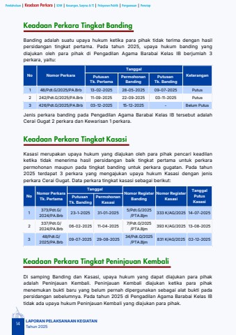 14LAPORAN PELAKSANAAN KEGIATANTahun 2025Keadaan Perkara Tingkat BandingBanding adalah suatu upaya hukum ketika para pihak tidak terima dengan hasilpersidangan tingkat pertama. Pada tahun 2025, upaya hukum banding yangdiajukan oleh para pihak di Pengadilan Agama Barabai Kelas IB berjumlah 3perkara, yaitu:No Nomor PerkaraTanggalPutusan KeteranganTk. PertamaPermohonanBandingPutusanTk. Banding1 48/Pdt.G/2025/PA.Brb 13-02-2025 28-05-2025 09-07-2025 Putus2 242/Pdt.G/2025/PA.Brb 11-09-2025 22-09-2025 03-11-2025 Putus3 426/Pdt.G/2025/PA.Brb 03-12-2025 15-12-2025 - Belum PutusJenis perkara banding pada Pengadilan Agama Barabai Kelas IB tersebut adalahCerai Gugat 2 perkara dan Kewarisan 1 perkara.Keadaan Perkara Tingkat KasasiKasasi merupakan upaya hukum yang diajukan oleh para pihak pencari keadilanketika tidak menerima hasil persidangan baik tingkat pertama untuk perkarapermohonan maupun pada tingkat banding untuk perkara gugatan. Pada tahun2025 terdapat 3 perkara yang mengajukan upaya hukum Kasasi dengan jenisperkara Cerai Gugat. Data perkara tingkat kasasi sebagai berikut:NoNomor PerkaraTk. PertamaTanggalNomor RegisterBandingNomor RegisterKasasiTanggalPutusKasasiPutusanTk. BandingPermohonanKasasi1373/Pdt.G/2024/PA.Brb23-1-2025 31-01-20255/Pdt.G/2025/PTA.Bjm333 K/AG/2025 14-07-20252337/Pdt.G/2024/PA.Brb06-02-2025 11-04-20257/Pdt.G/2025/PTA.Bjm393 K/AG/2025 13-08-2025348/Pdt.G/2025/PA.Brb09-07-2025 29-08-202534/Pdt.G/2025/PTA.Bjm831 K/AG/2025 02-12-2025Keadaan Perkara Tingkat Peninjauan KembaliDi samping Banding dan Kasasi, upaya hukum yang dapat diajukan para pihakadalah Peninjauan Kembali. Peninjauan Kembali diajukan ketika para pihakmenemukan bukti baru yang belum pernah dipergunakan sebagai alat bukti padapersidangan sebelumnya. Pada tahun 2025 di Pengadilan Agama Barabai Kelas IBtidak ada upaya hukum Peninjauan Kembali yang diajukan para pihak.