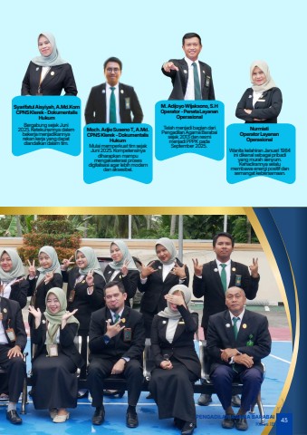 NurmiatiOperatorLayananOperasionalWanitakelahiranJanuari1984inidikenal sebagaipribadiyangmurahsenyum.Kehadirannyaselalumembawaenergipositifdansemangat kebersamaan.Moch.AdjieSusenoT,A.Md.CPNSKlerek-DokumentalisHukumMulaimemperkuattimsejakJuni2025.Kompetensinyadiharapkanmampumengakselerasiprosesdigitalisasiagarlebihmoderndanaksesibel.SyarifatulAisyiyah,A.Md.KomCPNSKlerek-DokumentalisHukumBergabungsejakJuni2025.Ketekunannyadalambekerjamenjadikannyarekankerjayangdapatdiandalkandalamtim.M.AdijoyoWijaksono,S.HOperator-PenataLayananOperasionalTelahmenjadibagiandariPengadilanAgamaBarabaisejak2013danresmimenjadiPPPKpadaSeptember2025.43PENGADILAN AGAMA BARABAIKelas IB