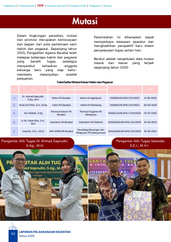 No. Nama Jabatan Nomor SK TMT Lama 1. Dr. Ahmad Saprudin,S.Ag., M.HKetua PA Barabai Ketua PA Ngamprah 89/KMA/SK.KP4.1.3/V/2025 12-06-2025 2. Rizal Arif Fitria, S.H., M.Ag Hakim PA Barabai Hakim PA Rembang 89/KMA/SK.KP4.1.3/V/2025 26-06-2025 3. Nur Hilaliah, S.AgPanmud Hukum PABarabaiPanmud Gugatan PAMartapura1536/DJA/SK.KP4.1.3/VII/2025 25-07-2025 4.H. M. Faisal Riza, S.H.,M.HSekretaris PA Barabai Sekretaris PA Pelaihari 25439/SEK/SK.KP4.1.3/V/2025 19-09-2025 5. Iskandar, S.E.I., M.H.I APK APBN PA Barabai Kasubbag Keuangan danPelaporan PTA Banjarmasin25442/SEK/SK.KP4.1.3/V/2025 19-09-2025Pengantar Alih Tugas Dr Ahmad Saprudin,S.Ag., M.H.MutasiDalam lingkungan peradilan, mutasidan promosi merupakan keniscayaandan bagian dari pola pembinaan karirhakim dan pegawai. Sepanjang tahun2025, Pengadilan Agama Barabai telahmelepas beberapa hakim dan pegawaiyang beralih tugas, sekaligusmenyambut kehadiran anggotakeluarga baru yang siap bahumembahu melanjutkan estafetpelayanan.TabelDaftarMutasiKeluarHakimdanPegawaiPengantar Alih Tugas Iskandar,S.E.I., M.H.IPerpindahan ini diharapkan dapatmemperkaya wawasan aparatur danmenghadirkan perspektif baru dalampenyelesaian tugas sehari-hari.Berikut adalah rekapitulasi data mutasimasuk dan keluar yang terjadisepanjang tahun 2025:50LAPORAN PELAKSANAAN KEGIATANTahun 2025