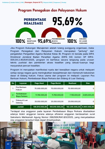 100%POSBANTUANHUKUM 95,69%PEMBEBASANBIAYAPERKARA 100%SIDANGDI LUARGEDUNGNo Layanan Pagu Awal Pagu Revisi Realisasi Sisa1Pos BantuanHukum70.000.000,00 70.000.000,00 70.000.000,00 02PembebasanBiaya Perkara11.760.000,00 11.760.000,00 7.155.000,00 4.605.000,003Sidang di LuarGedung25.050.000,00 25.050.000,00 25.050.000,00 0Jumlah 106.810.000,00 106.810.000,00 102.205.000,00 4.605.000,0060LAPORAN PELAKSANAAN KEGIATANTahun 2025Program Penegakan dan Pelayanan HukumJika Program Dukungan Manajemen adalah tulang punggung organisasi, makaProgram Penegakan dan Pelayanan Hukum merupakan \pengabdian Pengadilan Agama Barabai Kelas IB. Program ini berada pada DIPADirektorat Jenderal Badan Peradilan Agama (DIPA 04) nomor: SP DIPA005.04.2.402541/2025, program ini berfokus secara langsung pada urusanteknis yustisial dan pemberian akses keadilan yang seluas-luasnya bagimasyarakat pencari keadilan.Terdapat sisa anggaran pada layanan Pembebasan Biaya Perkara disebabkanadanya blokir anggaran karena adanya efisiensi anggaran berdasarkan suratSekretaris Mahkamah Agung Nomor 266/SEK/RA1.8/II/2025, yang menyebabkansisa anggaran tersebut tidak dapat direalisasikan.PersentaseRealisasi95,69%Program ini merupakan manifestasi nyata dari kewajiban negara untuk melayanisetiap warga negara guna meningkatkan kesejahteraan dan memenuhi kebutuhandasar di bidang hukum. Fokus utama dari program ini meliputi: Layanan PosBantuan Hukum, Pembebasan Biaya Perkara dan Sidang di Luar Gedung.