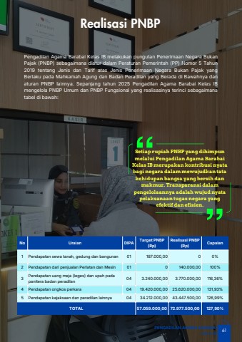 No Uraian DIPATarget PNBP(Rp)Realisasi PNBP(Rp)Capaian1 Pendapatan sewa tanah, gedung dan bangunan 01 187.000,00 0 0%2 Pendapatan dari penjualan Perlatan dan Mesin 01 0 140.000,00 100%3Pendapatan uang meja (leges) dan upah padapanitera badan peradilan04 3.240.000,00 3.770.000,00 116,36%4 Pendapatan ongkos perkara 04 19.420.000,00 25.620.000,00 131,93%5 Pendapatan kejaksaan dan peradilan lainnya 04 34.212.000,00 43.447.500,00 126,99%TOTAL 57.059.000,00 72.977.500,00 127,90%Setiap rupiah PNBP yang dihimpunmelalui Pengadilan Agama BarabaiKelas IB merupakan kontribusi nyatabagi negara dalam mewujudkan tatakehidupan bangsa yang bersih danmakmur. Transparansi dalampengelolaannya adalah wujud nyatapelaksanaan tugas negara yangefektif dan efisien.61PENGADILAN AGAMA BARABAIKelas IBRealisasi PNBPPengadilan Agama Barabai Kelas IB melakukan pungutan Penerimaan Negara BukanPajak (PNBP) sebagaimana diatur dalam Peraturan Pemerintah (PP) Nomor 5 Tahun2019 tentang Jenis dan Tarif atas Jenis Penerimaan Negara Bukan Pajak yangBerlaku pada Mahkamah Agung dan Badan Peradilan yang Berada di Bawahnya danaturan PNBP lainnya. Sepanjang tahun 2025 Pengadilan Agama Barabai Kelas IBmengelola PNBP Umum dan PNBP Fungsional yang realisasinya terinci sebagaimanatabel di bawah: