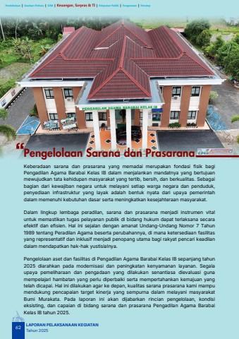 Pengelolaan Sarana dan Prasarana62LAPORAN PELAKSANAAN KEGIATANTahun 2025Keberadaan sarana dan prasarana yang memadai merupakan fondasi fisik bagiPengadilan Agama Barabai Kelas IB dalam menjalankan mandatnya yang bertujuanmewujudkan tata kehidupan masyarakat yang tertib, bersih, dan berkualitas. Sebagaibagian dari kewajiban negara untuk melayani setiap warga negara dan penduduk,penyediaan infrastruktur yang layak adalah bentuk nyata dari upaya pemerintahdalam memenuhi kebutuhan dasar serta meningkatkan kesejahteraan masyarakat.Dalam lingkup lembaga peradilan, sarana dan prasarana menjadi instrumen vitaluntuk memastikan tugas pelayanan publik di bidang hukum dapat terlaksana secaraefektif dan efisien. Hal ini sejalan dengan amanat Undang-Undang Nomor 7 Tahun1989 tentang Peradilan Agama beserta perubahannya, di mana ketersediaan fasilitasyang representatif dan inklusif menjadi penopang utama bagi rakyat pencari keadilandalam mendapatkan hak-hak yustisialnya.Pengelolaan aset dan fasilitas di Pengadilan Agama Barabai Kelas IB sepanjang tahun2025 diarahkan pada modernisasi dan peningkatan kenyamanan layanan. Segalaupaya pemeliharaan dan pengadaan yang dilakukan senantiasa dievaluasi gunamempelajari hambatan yang perlu diperbaiki serta mempertahankan kemajuan yangtelah dicapai. Hal ini dilakukan agar ke depan, kualitas sarana prasarana kami mampumendukung pencapaian target kinerja yang sempurna dalam melayani masyarakatBumi Murakata. Pada laporan ini akan dijabarkan rincian pengelolaan, kondisieksisting, dan capaian di bidang sarana dan prasarana Pengadilan Agama BarabaiKelas IB tahun 2025.