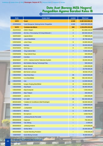 Data Aset (Barang Milik Negara)Pengadilan Agama Barabai Kelas IBKode Uraian Aset Jumlah Nilai Aset 131111 Tanah 4.500 6.691.500.000,00 2010104026 Tanah Bangunan Gedung Kantor Pengadilan 4.500 6.691.500.000,00 132111 Peralatan dan Mesin 385 3.153.676.333,00 3020101003 Station Wagon 2 453.868.328,00 3020102003 Mini Bus ( Penumpang 14 Orang Kebawah ) 2 361.500.000,00 3020104001 Sepeda Motor 4 67.988.545,00 3050104001 Lemari Besi/Metal 7 80.700.000,00 3050104002 Lemari Kayu 9 22.800.000,00 3050104003 Rak Besi 4 20.000.000,00 3050104004 Rak Kayu 6 1.800.000,00 3050104005 Filing Cabinet Besi 7 11.050.000,00 3050104006 Filing Cabinet Kayu 1 500.000,00 3050104007 Brandkas 1 2.580.000,00 3050105007 CCTV - Camera Control Television System 1 20.000.000,00 3050105012 Alat Detektor Barang Terlarang/X Ray 1 500.000,00 3050105017 Mesin Absensi 1 5.000.000,00 3050105080 Mesin Antrian 1 24.700.000,00 3050199999 Alat Kantor Lainnya 1 30.942.375,00 3050201002 Meja Kerja Kayu 26 84.610.500,00 3050201003 Kursi Besi/Metal 108 128.240.000,00 3050201005 Sice 6 44.500.000,00 3050201006 Bangku Panjang Besi/Metal 8 20.800.000,00 3050201008 Meja Rapat 3 84.950.000,00 3050201009 Meja Komputer 3 1.333.333,00 3050201013 Meja Telepon 1 250.000,00 3050204001 Lemari Es 1 1.200.000,00 3050204004 A.C. Split 25 162.300.000,00 3050204005 Portable Air Conditioner (Alat Pendingin) 2 50.000.000,00 3050206002 Televisi 2 6.836.000,00 3050206007 Loudspeaker 9 52.836.000,00 3050206012 Wireless 5 4.650.000,00 3050206014 Microphone 7 3.846.150,00 3050206026 Lambang Garuda Pancasila 2 18.000,00 3050206036 Dispenser 1 700.000,00 3050206040 Palu Sidang 1 12.000,00 3050206042 Lambang Instansi 1 4.174.500,00 3050206057 Vertikal Blind 1 25.000.000,00 3050206080 Bracket Standing Peralatan 1 2.155.620,00 3060101001 Audio Mixing Console 1 16.483.500,0066LAPORAN PELAKSANAAN KEGIATANTahun 2025