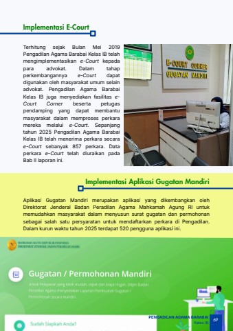 69PENGADILAN AGAMA BARABAIKelas IBImplementasi E-CourtTerhitung sejak Bulan Mei 2019Pengadilan Agama Barabai Kelas IB telahmengimplementasikan e-Court kepadapara advokat. Dalam tahapperkembangannya e-Court dapatdigunakan oleh masyarakat umum selainadvokat. Pengadilan Agama BarabaiKelas IB juga menyediakan fasilitas eCourt Corner beserta petugaspendamping yang dapat membantumasyarakat dalam memproses perkaramereka melalui e-Court. Sepanjangtahun 2025 Pengadilan Agama BarabaiKelas IB telah menerima perkara secarae-Court sebanyak 857 perkara. Dataperkara e-Court telah diuraikan padaBab II laporan ini.Implementasi Aplikasi Gugatan MandiriAplikasi Gugatan Mandiri merupakan aplikasi yang dikembangkan olehDirektorat Jenderal Badan Peradilan Agama Mahkamah Agung RI untukmemudahkan masyarakat dalam menyusun surat gugatan dan permohonansebagai salah satu persyaratan untuk mendaftarkan perkara di Pengadilan.Dalam kurun waktu tahun 2025 terdapat 520 pengguna aplikasi ini.
