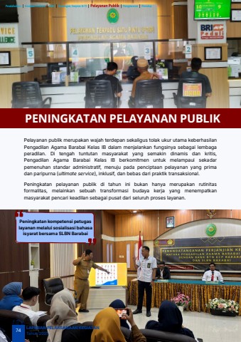 74LAPORAN PELAKSANAAN KEGIATANTahun 2025Peningkatan pelayanan publik di tahun ini bukan hanya merupakan rutinitasformalitas, melainkan sebuah transformasi budaya kerja yang menempatkanmasyarakat pencari keadilan sebagai pusat dari seluruh proses layanan.Pelayanan publik merupakan wajah terdepan sekaligus tolak ukur utama keberhasilanPengadilan Agama Barabai Kelas IB dalam menjalankan fungsinya sebagai lembagaperadilan. Di tengah tuntutan masyarakat yang semakin dinamis dan kritis,Pengadilan Agama Barabai Kelas IB berkomitmen untuk melampaui sekadarpemenuhan standar administratif, menuju pada penciptaan pelayanan yang primadan paripurna (ultimate service), inklusif, dan bebas dari praktik transaksional.PENINGKATAN PELAYANAN PUBLIKPeningkatan kompetensi petugaslayanan melalui sosialisasi bahasaisyarat bersama SLBN Barabai