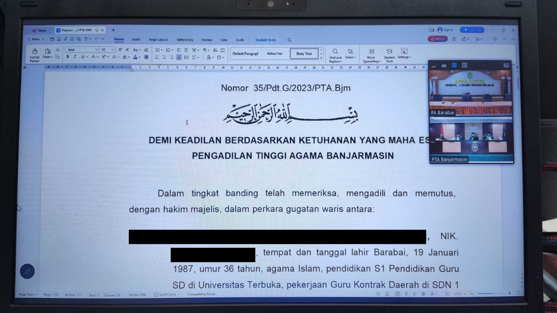 PANITERA PENGADILAN AGAMA BARABAI HADIRI SIDANG VIRTUAL PEMBACAAN PUTUSAN BANDING